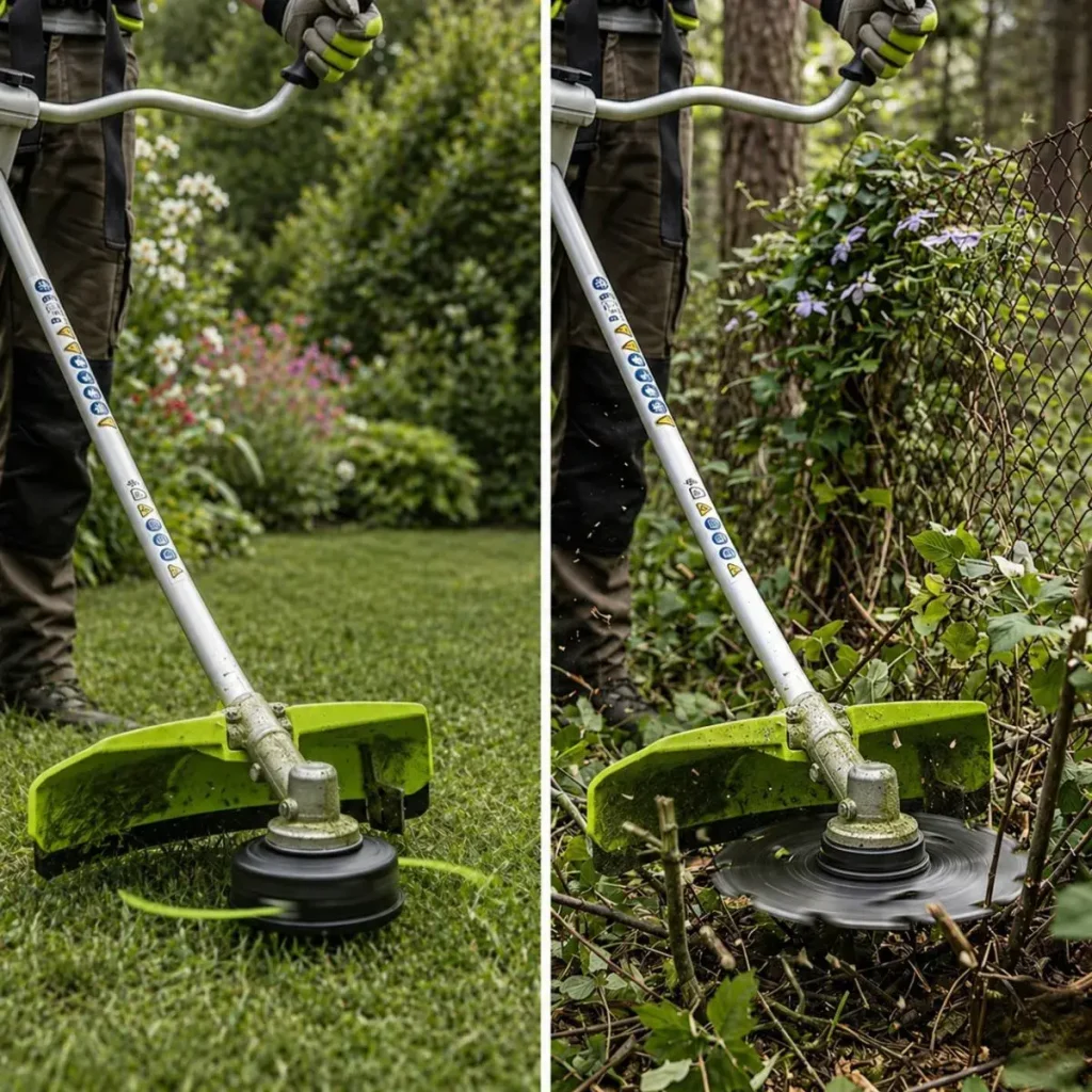 Sistema con cabezal de hilo para césped y disco metálico para arbustos y vegetación resistente. Cambio rápido con tecnología FastSwitch.