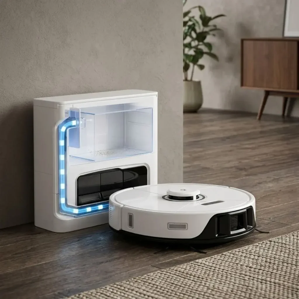 După fiecare ciclu, robotul descarcă murdăria în stația dedicată. Nu mai este nevoie de golire frecventă. Funcționează până la 60 de zile fără intervenție.